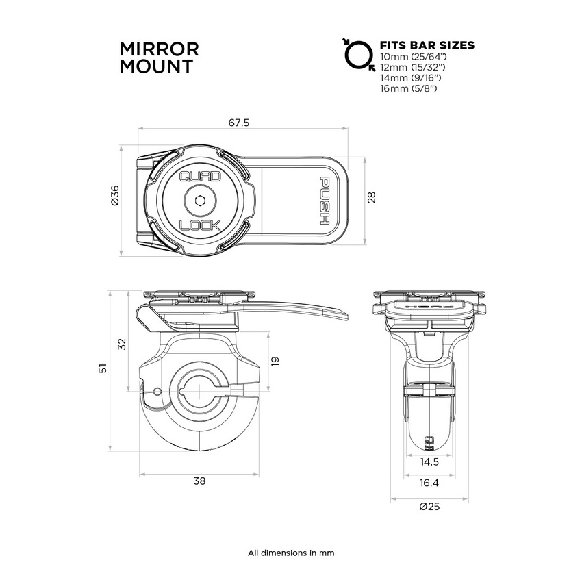 - 1 soporte de espejo Quad Lock® - compatible con barras de 16 mm (5/8")