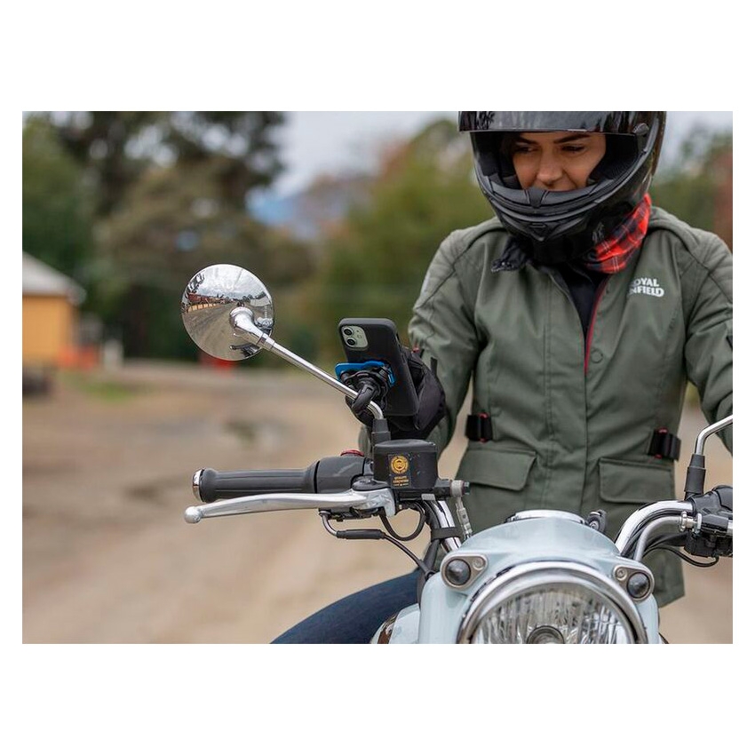 Confiar en que tu teléfono se mantendrá en su lugar sin importar el terreno es vital. El soporte para espejos Quad Lock® cuenta con un candado de doble etapa patentado que asegura una fijación fuerte y estable de tu dispositivo, permitiéndote concentrarte en el camino con total tranquilidad.