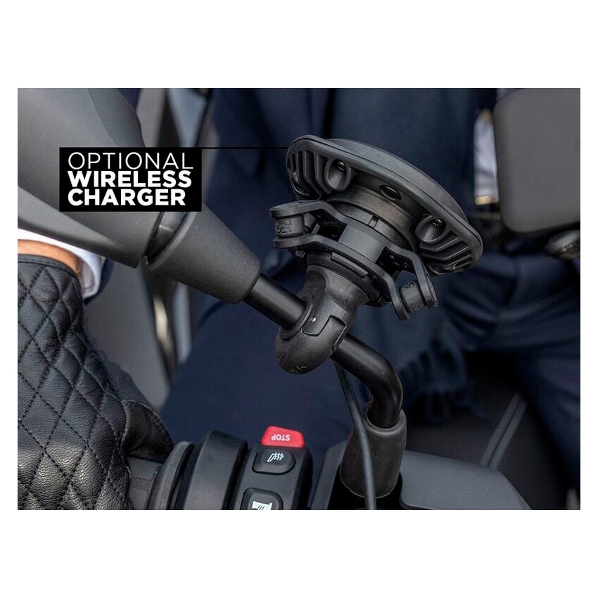 El soporte para espejos Quad Lock® está diseñado para integrarse de manera discreta en el brazo del espejo de tu moto o scooter, manteniendo la estética sin comprometer la funcionalidad.
