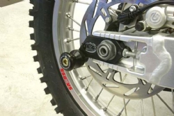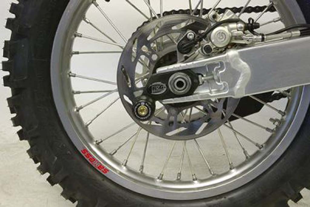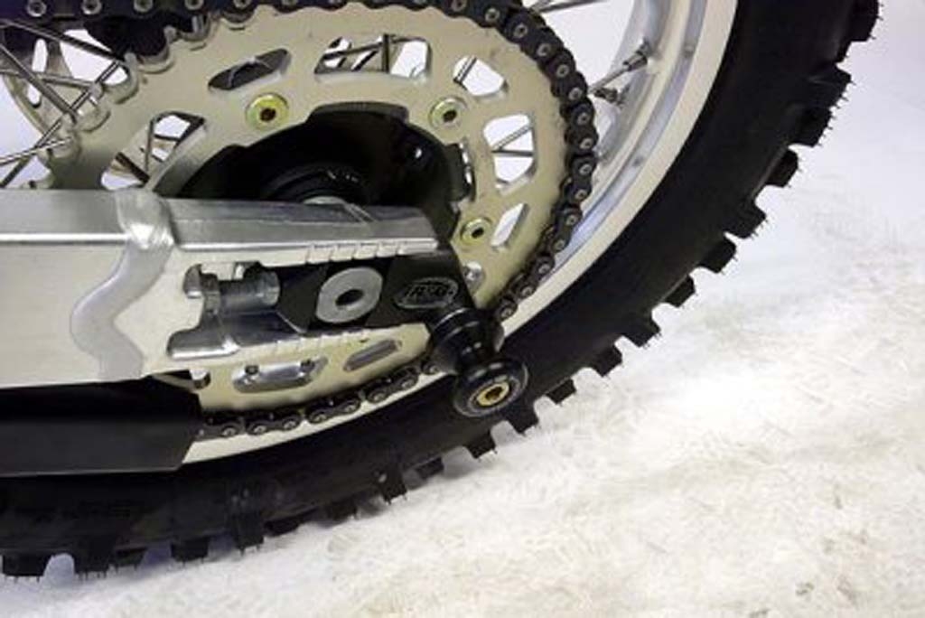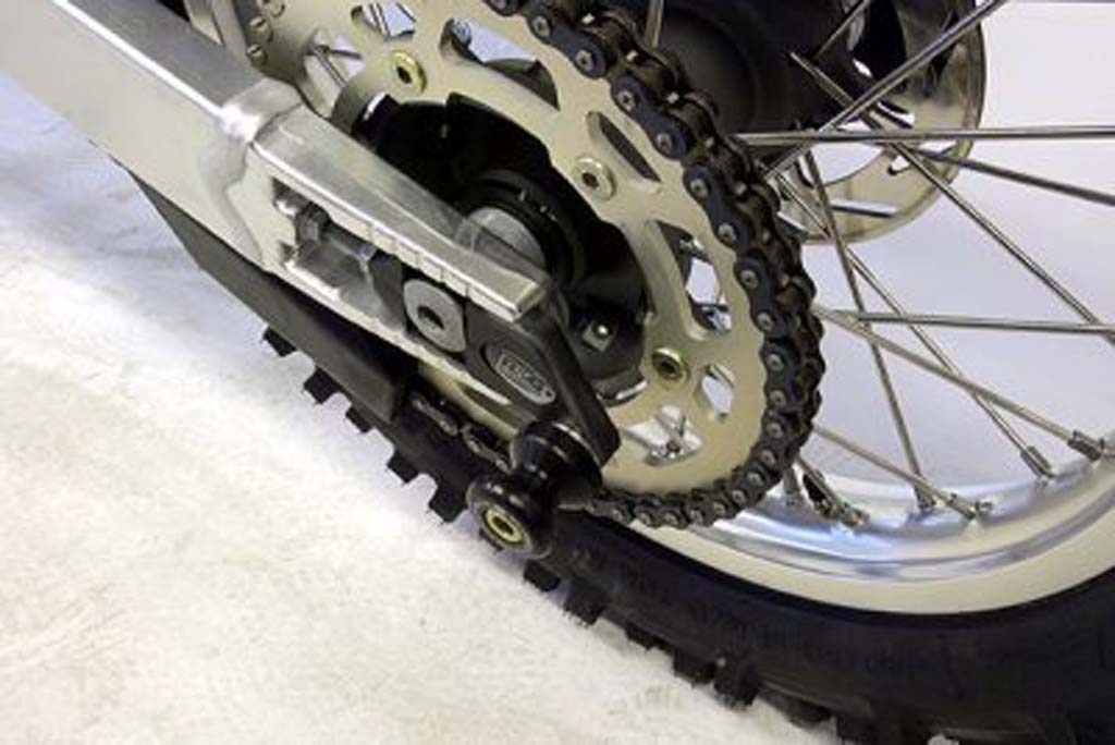 Los soportes de caballete con Offset de RG Racing están diseñados para proteger el basculante y los componentes clave de daños en caso de una caída, deslizamiento o accidente. Además, actúan como un punto de apoyo para levantar la rueda trasera de la moto con un caballete de paddock, facilitando tareas como el ajuste de la cadena, su lubricación y la limpieza general de la rueda.
