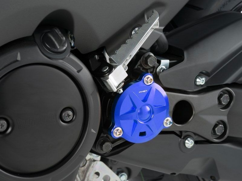 Tapa piñón Puig 8502A Hi-Tech Yamaha T-Max 530 2012/2016 Azul. Nueva tapa de piñón Puig 8502A específica para la Yamaha T-Max 530 y que le da un toque de elegancia. Realizado an aluminio anodizado, la tapa de piñón Puig 8502A forma parte de una línea de accesorios llamada Hi-Tech y que Puig ofrece para personalizar las T-Max. Su instalación es muy sencilla. La tapa piñón Puig 8502 está disponible en 5 colores diferentes.