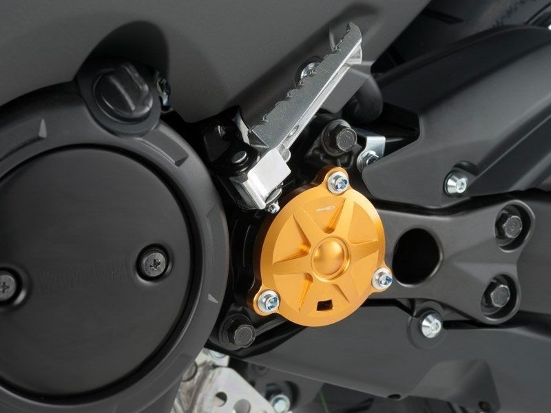 Tapa piñón Puig 8502O Hi-Tech Yamaha T-Max 530 2012/2016 Oro. Nueva tapa de piñón Puig 8502O específica para la Yamaha T-Max 530 y que le da un toque de elegancia. Realizado an aluminio anodizado, la tapa de piñón Puig 8502O forma parte de una línea de accesorios llamada Hi-Tech y que Puig ofrece para personalizar las T-Max. Su instalación es muy sencilla. La tapa piñón Puig 8502 está disponible en 5 colores diferentes.