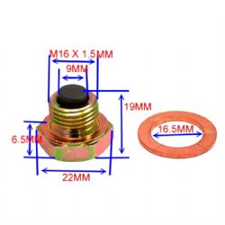 Tornillo magnético drenaje aceite JMP 7239361 M16x1.5 con el anillo de sellado. El Tornillo Magnético de Drenaje de Aceite 7239361 M16x1.5 es una pieza esencial para el mantenimiento eficiente de tu vehículo. Con una rosca de 7239361 M16x1.5 y una longitud de 19 mm, este tornillo está diseñado para ofrecer una solución segura y fiable para el drenaje del aceite. La cabeza hexagonal, con una anchura de llave de 22 mm, permite una instalación y extracción sin esfuerzos, asegurando que el proceso de mantenimiento sea tan sencillo como sea posible.