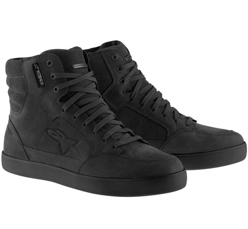 Zapatillas Alpinestars J-6 Waterproof Negras. Elegantes zapatillas de moto ideales para uso diario en ciudad. Realizadas en piel de plena flor y ante, las J-6 se puede usar perfectamente en días de lluvia, gracias a su membrana Waterproof (100% impermeable). Estas zapatillas van equipadas con protectores anatómicos en la zona del talón y tobillo para mayor seguridad; derivan de las protecciones que se usan en las botas de Motocross Alpinestars.