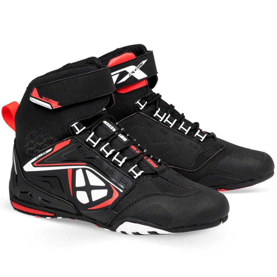 Zapatillas Ixon Killer Wp Negro / Blanco/ Rojo. Las zapatillas de moto Ixon Killer WP ofrecen una óptima seguridad y confort para los motociclistas urbanos. Estas zapatillas están homologadas, cuentan con una membrana impermeable y transpirable que no solo te mantendrá cómodo, sino que también te protegerá de la intemperie. Están fabricadas con microfibra de poliuretano más tejido antidesgarro estilo panal para lograr un alto nivel de comodidad y resistencia. Los refuerzos en el antepié y talón, así como la correa en el talón para colocártelas, te darán un calce seguro. La suela se eleva en el exterior, contando con inserciones de plástico para los cordones. El refuerzo de material en la parte frontal del pie, hace de ellas una opción confortable al igual que la nueva horma y suela para un mejor ajuste y respuesta por encima y por debajo del pie. Con las nuevas zapatillas Ixon Killer WP podrás disfrutar encima de la moto e irás cómodo cunado bajes de ella.