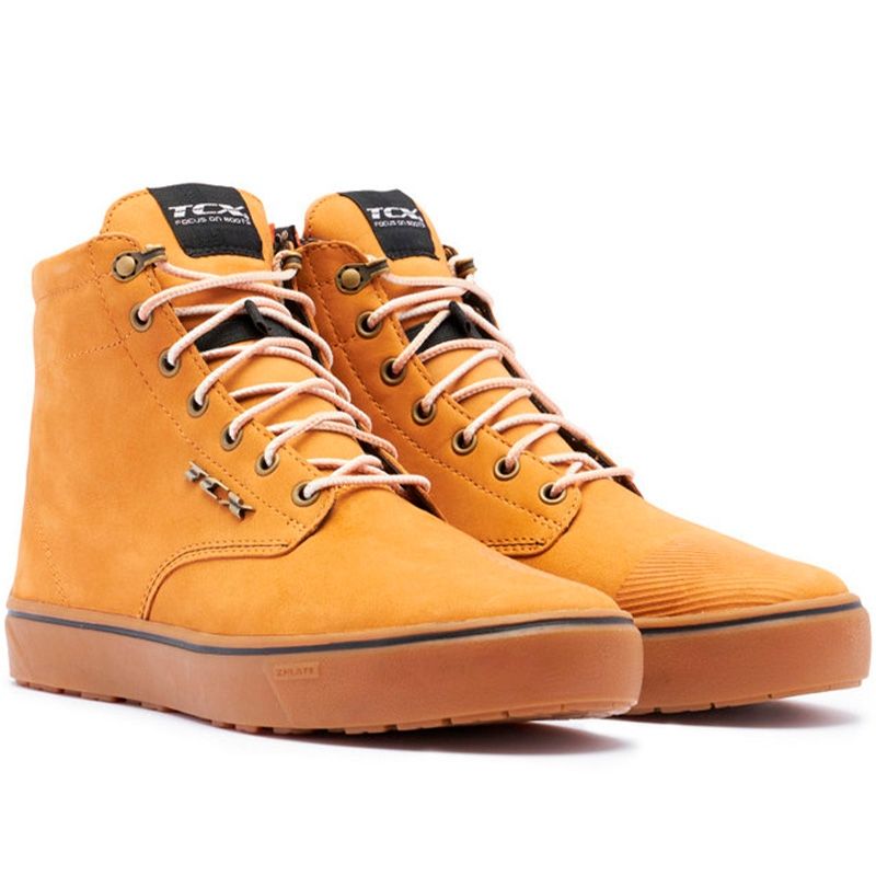 Zapatillas TCX Dartwood WP Marrón Claro (colección botas TCX 2024). Nuevas zapatillas de moto certificadas TCX Dartwood con aspecto casual y perfectas para ir con elegancia y seguridad en el día a día por la ciudad. Fabricadas en piel de plena flor con forro impermeable T-Dry que mantiene los pies secos en todo momento. El cierre se realiza mediante cremallera lateral y cordones con banda elástica donde puedes guardar los lazos y así evitar que se enganchen en los estribos de la moto. Las TCX Dartwood disponen de protecciones de última generación D3O en el maléolo además de otros protectores en la puntera y en el talón. La suela Groundtrax está diseñada para garantizar estabilidad, adherencia y tracción tanto arriba de la moto como una vez bajo. La entresuela posee la inserción Zplate para mantener una correcta flexibilidad del zapato y además garantiza una correcta rigidez transversal para proteger el pie en caso de caída. En definitiva, unas zapatillas que te permitirán conducir con seguridad y estilo, las 24 horas del día, los 7 días de la semana.