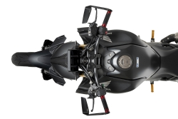 Gracias a su estudiada aerodinámica, el alerón Puig reduce el efecto wheelie, minimiza las oscilaciones a alta velocidad (anti-shimmie) y aporta un comportamiento más estable en cambios de dirección. Además, no requiere perforaciones ni modificaciones en la moto: se fija mediante un soporte metálico de 3 mm incluido en el kit.