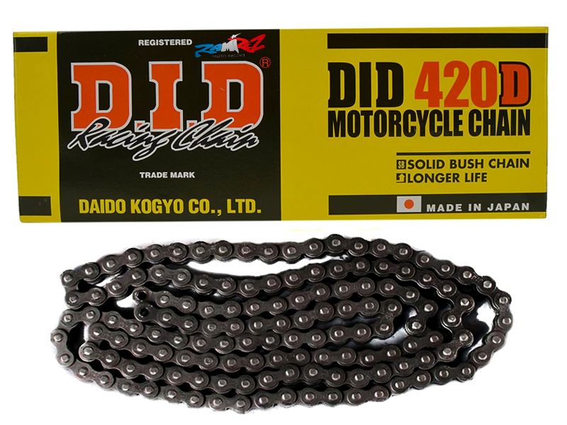 Cadena DID 420D 116 eslabones negro. Cadena DID (Standard) sin retenes con paso 420 y diseñada para motos de calle de entre 50 y 125 cc. La cadena DID de la serie D ofrece una esistencia al desgaste de 700 y un promedio de resistencia al estiramiento de 15,8. Sistema de cierre con clip.