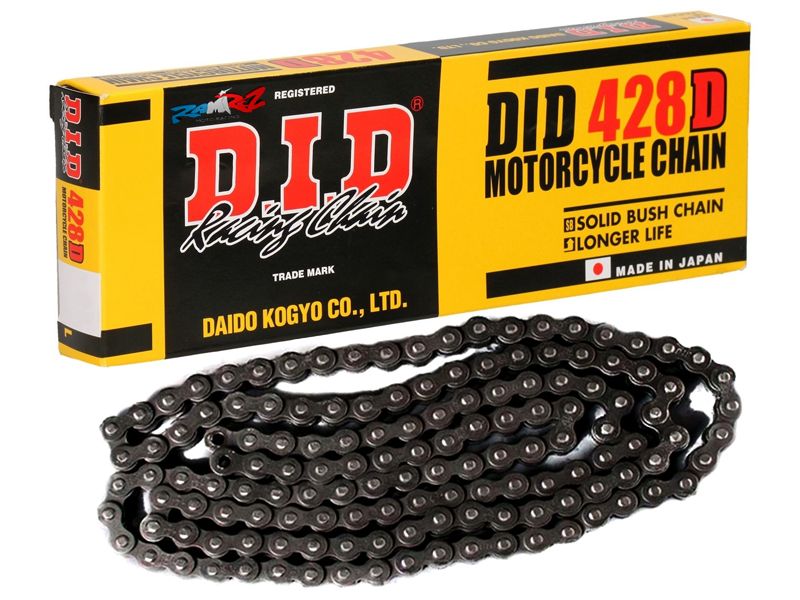 Cadena DID 428D 116 eslabones negro. Cadena DID Standard (D) en paso 428 para motos de calle de entre 50 y 125 cc, y motos de cross de entre 50 y 125 c.c. Resistencia al desgaste: 410. Promedio resistencia al estiramiento: 25,5. Tratada con el sistema SDH de DID, que aporta a la superficie de los eslabones una capa de carburo de cromo de extrema dureza, manteniendo una suave estructura interna y otorgándole propiedades anti-oxidación. Cierre con clip.