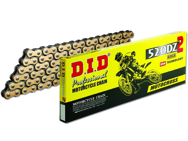 Cadena DID 520DZ2SDH 120 eslabones oro/negro. La DID 520DZ2 es una cadena de motocross de alto rendimiento, no sellada y que se caracteriza por su precio económico. Por sus prestaciones, es equiparable a la cadena DID ERT3 y gracias a la tecnología patentada de clavijas SDH que incorpora, es capaz de soportar las fuertes exigencias a las que son sometidas las cadenas en los circuitos de motocross.