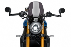 Carenabris Puig 21431F Naked New Generation Sport Yamaha XSR 900 2022-2023. Parabrisas Puig 21431 Naked New Generation específica para la nueva Yamaha XSR 900 2022-2023 y que gracias a su metracrilato de alto impacto con grosor de 3 mm, ofrece una gran resistencia y excelente fijación a la moto. Esta cúpula ha sido perfectamente estudiada para mejorar la protección del motorista contra el viento.