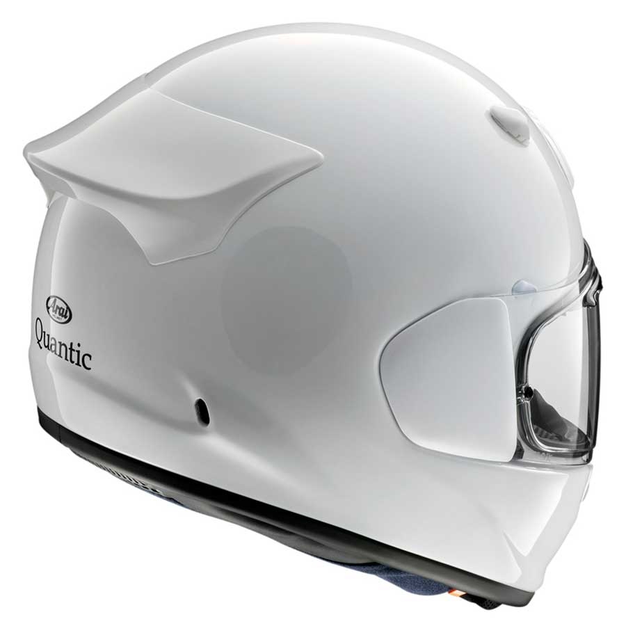 En la parte trasera, el escape / spoiler trasero de una sola pieza, con mando de 3 posiciones, deriva del DF-X2 del RX-7V Racing, pero adaptado al uso touring. Se probó a altas velocidades y ayuda a estabilizar Casco Arai Quantic Blanco Brillante y extraer el aire caliente, reduciendo turbulencias y fatiga del piloto. Se completa con salidas laterales integradas y una abertura de escape en el cuello para mejorar la evacuación del calor desde la zona inferior.