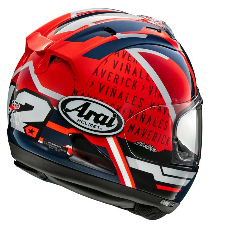 El Casco Arai RX-7V EVO Maverick se ha desarrollado y probado en competición. La combinación de la forma de la calota y el Air Wing® trasero regulable está pensada para reducir turbulencias, minimizar sacudidas a alta velocidad y mejorar la estabilidad general cuando vas acoplado o en plena frenada.
