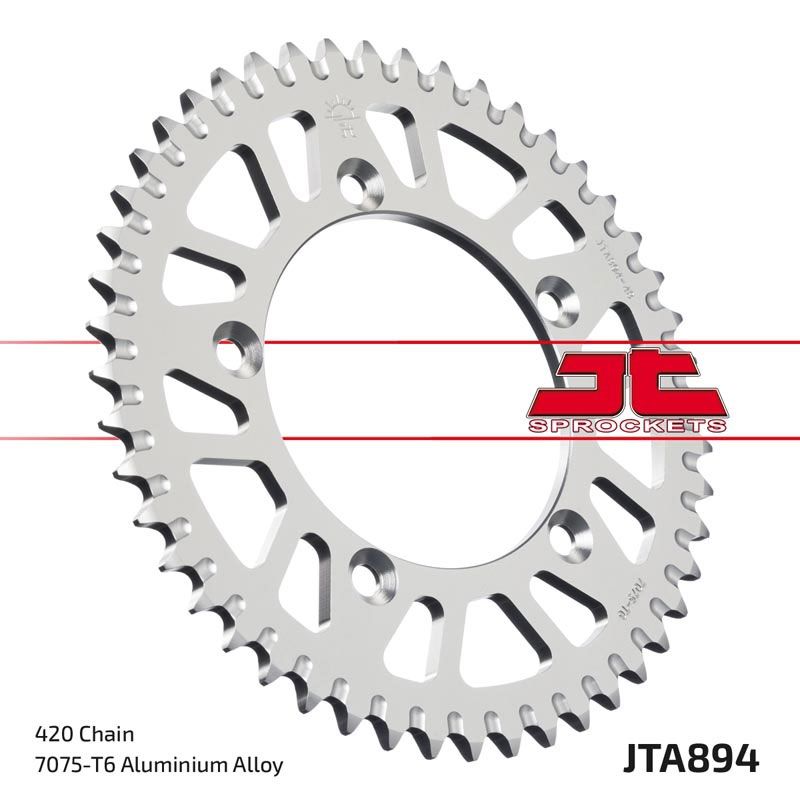 Corona Jt sprockets JTA894 48. La corona Jt sprockets JTA894 48 posee la mejor calidad y durabilidad con la mejor relación calidad y precio disponible en el mercado. Fabricada en aleación 7075-T6 de aluminio, esta versión de corona Jt Sprockets, disminuye el peso respecto a la corona de acero con las siglas JTR y cuenta con algo menos de durabilidad. Todo el proceso se realiza mediante computadora CNC y equipo de control de corte de metal, proporcionado un acabado inmejorable. Las coronas y piñones Jt Sprockets para kits de transmisión de moto, son utilizados por fabricantes como Honda, Yamaha, Kawasaki, etc en sus equipaciones de serie.