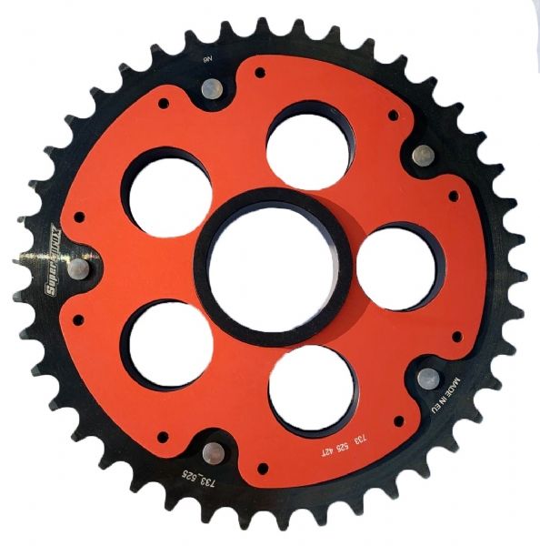 Corona Supersprox RSA733525X45RED Ducati Hypermotard 821 2013-2015. Corona Stealth negra en cuerpo de aluminio y 43 dientes de acero con acabados de la mejor calidad y diseñada para ofrecer la mejor durabilidad. La corona Supersprox Stealth posee el cuerpo interior de aluminio y la corona exterior en acero con tratamiento anticorrosión tres veces más duradera y resistente que una corona de aluminio. Dientes ranurados para evitar la acumulación de suciedad. La imagen mostrada es simplemente orientativa.