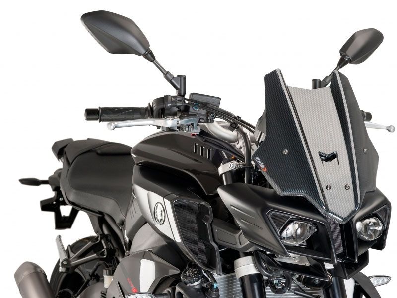 Carenabris Cúpula Puig Racing 8917C Yamaha MT-10 2016 Símil carbono. La cúpula Puig 8917C Racing derivada directamente de la experiencia adquirida en competición. Su diseño es específico para la nueva Yamaha MT-10 y gracias a su doble altura, mejora notablemente la aerodinámica y la disminución del efecto del viento sobre el casco. De la resistencia se encarga un acrílico de alto impacto con 3 mm de grosor que garantiza la máxima durabilidad y acabados impecables. Se ha comprobado en el tunel del viento, que las cúpulas racing z-racing mejoran el coeficiente aerodinámico en un 12,7% de media.