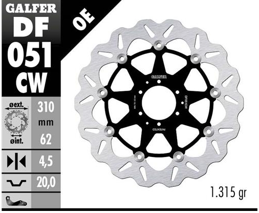 Disco de freno Galfer DF051CW Wave Flotante Completo Nucleo Aluminio 310mm. Descubre la máxima tecnología en sistemas de frenado con los discos de freno Galfer Wave Flotantes. Estos discos de freno están diseñados para ofrecer un rendimiento superior, combinando potencia de frenado y una excelente capacidad de disipación del calor, ideales para los motociclistas que exigen lo mejor en sus rutas.