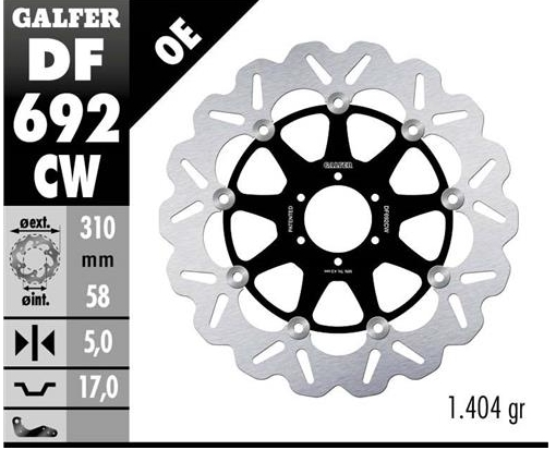 Disco de freno Galfer DF692CW Wave Flotante Completo Nucleo Aluminio 310mm. Descubre la máxima tecnología en sistemas de frenado con los discos de freno Galfer Wave Flotantes. Estos discos de freno están diseñados para ofrecer un rendimiento superior, combinando potencia de frenado y una excelente capacidad de disipación del calor, ideales para los motociclistas que exigen lo mejor en sus rutas.