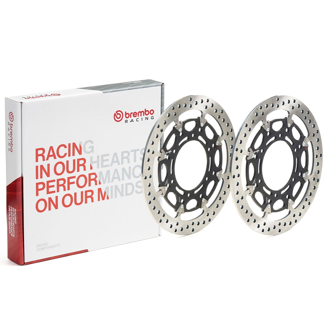 Kit discos freno Brembo 208A98510 T-Drive (2 unidades). El disco de freno Brembo T-Drive concentra la tecnología más avanzada de Brembo en la competición, hasta ahora exclusiva de MotoGP y SBK. El nuevo sistema de anclaje del interior de la pista en forma de T es la principal innovación de este disco de freno frente a los tradicionales pasadores cilíndricos. Este nuevo sistema de acoplamiento permite una mejor transferencia de potencia de frenado y una mayor resistencia a las torsiones termo-mecánicas. La pista del disco Brembo T-Drive es más ligera y eficaz debido a la nueva posición de los taladros y de sus diferentes diámetros. El interior del disco fue diseñado con el propósito de convertirse en el mejor jamás fabricado. El mecanizado en aluminio y su tratamiento de anodizado duro le ofrecen al disco de freno T-Drive una gran dureza y ligereza. En algunos modelos sobredimensionados es posible que se requiera de los espaciadores para su montaje. Adjuntamos PDF con más información del kit de discos Brembo 208A98510.