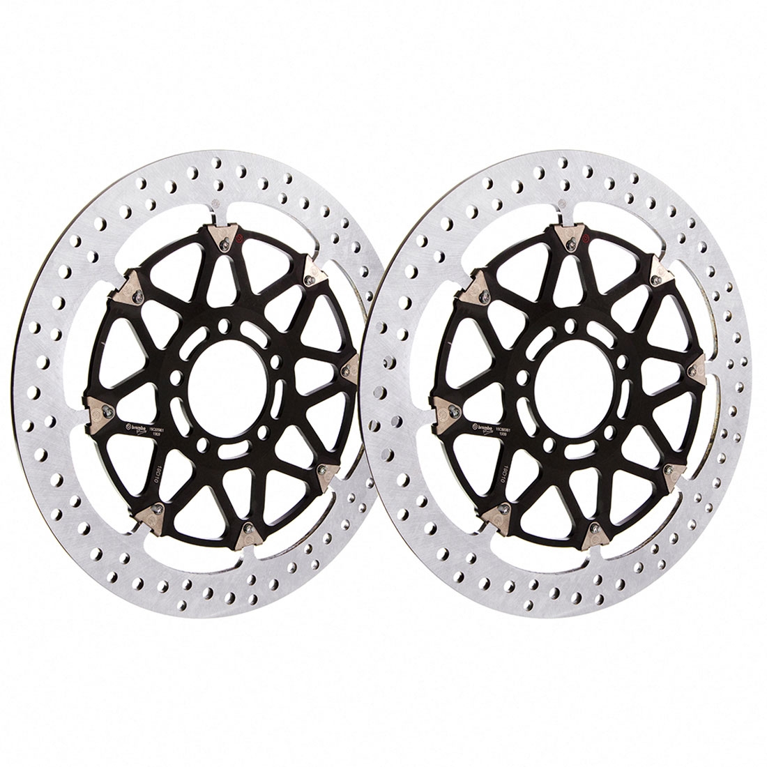 Kit discos freno Brembo 208A98511 T-Drive (2 unidades). El disco de freno Brembo T-Drive concentra la tecnología más avanzada de Brembo en la competición, hasta ahora exclusiva de MotoGP y SBK. El nuevo sistema de anclaje del interior de la pista en forma de T es la principal innovación de este disco de freno frente a los tradicionales pasadores cilíndricos. Este nuevo sistema de acoplamiento permite una mejor transferencia de potencia de frenado y una mayor resistencia a las torsiones termo-mecánicas. La pista del disco Brembo T-Drive es más ligera y eficaz debido a la nueva posición de los taladros y de sus diferentes diámetros. El interior del disco fue diseñado con el propósito de convertirse en el mejor jamás fabricado. El mecanizado en aluminio y su tratamiento de anodizado duro le ofrecen al disco de freno T-Drive una gran dureza y ligereza. En algunos modelos sobredimensionados es posible que se requiera de los espaciadores para su montaje. Adjuntamos PDF con más información del kit de discos Brembo 208A98511.
