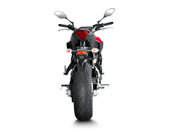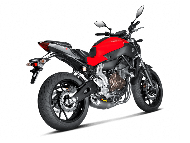 Escape completo Akrapovic S-Y7R1-HAFT Modelo Racing Line Yamaha MT-07 2014-2016. Diseñado especialmente para cada modelo de moto, el escape completo Akrapovic S-Y7R1-HAFT se caracteriza por el excelente rendimiento que ofrece en la moto y por su peso ligero. La versión de escape Racing Line posee los colectores en acero inoxidable. Este escape completo rebaja sustancialmente el peso total respecto al escape original. El escape completo Akrapovic S-Y7R1-HAFT también aporta una notable mejora en cuanto a prestaciones de motor se refiere. El Slip-On está realizado en en fibra de carbono o titanio (según versión de escape) al igual que la copa final que también es de carbono.