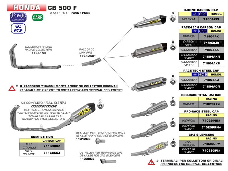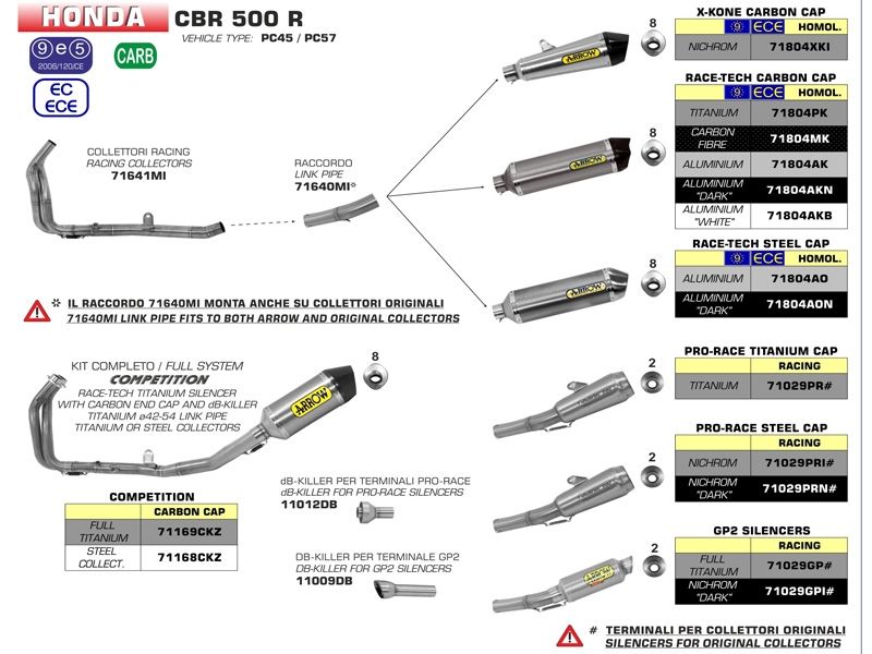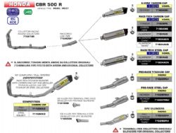 Escape Arrow 71029PR Pro-Race Honda CB 500 F / CBR 500 R 2016-2018. Slip-on Arrow 71029PR deriva directamente de los escapes de Moto Gp con forma de trompeta. Para compensar la reducción del volumen, Arrow ha trabajado arduamente en la investigación de los mejores materiales fonoabsorbentes y termo aislantes. Se han realizado innumerables pruebas en pista y en el Departamento de Investigación y Desarrollo que le han permitido a Arrow introducir materiales y tecnologías nuevas más eficaces en el proceso de producción. (La información que facilita Ramirez Motoracing es orientativa y sujeta a la verificación en la web del fabricante).