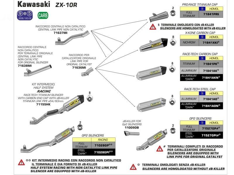 Silencioso escape Race-Tech Arrow 71155HK Kawasaki ZX-10R 2016 (sistema intermedio racing - Silencioso Race-Tech de titanio + conector de titanio ø60mm). El slip-on escape Arrow Race-Tech 71155HK se caracteriza por su diseño en forma de diamante que garantiza una disminución del peso, sin afectar el volumen interno ni los niveles de ruído. Realizado interiormente en acero inox con la funda exterior en titanio, cuenta con el terminal en carbono y dB-killer extraíble.