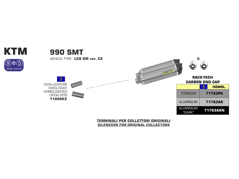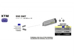 Silencioso escape Race-Tech Arrow 71763AKN Ktm 990 SMT 2009 / 2013 Aluminio Dark fondo Carbono. El slip-on escape Arrow Race-Tech 71763AKN se caracteriza por su diseño en forma de diamante que garantiza una disminución del peso, sin afectar el volumen interno ni los niveles de ruído. Realizado interiormente en acero inox con la funda exterior en aluminio plata, cuenta con el terminal en aluminio dark y dB-killer extraíble.