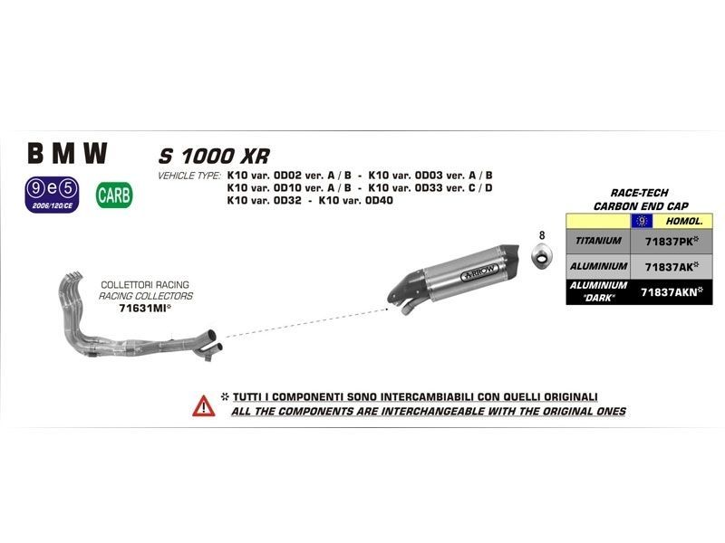 Silencioso escape Race-Tech Arrow 71837AKN Bmw S 1000 Xr 2015 Aluminio Dark con fondo en carbono. El silencioso de escape Arrow 7183AKB Race-Tech se caracteriza por su diseño en forma de diamante que garantiza una disminución del peso, sin afectar el volumen interno ni los niveles de ruído. Realizado interiormente en acero inox con la funda exterior en carbono, cuenta con el terminal en carbono y dB-killer extraíble. Imagen genérica.