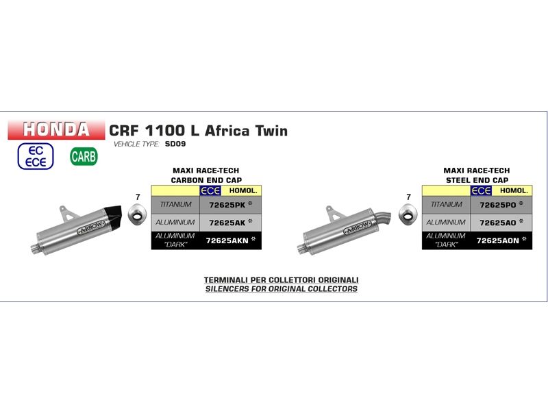 Escape Arrow 72625PK Maxi Race-Tech Honda CRF 1100 L Africa Twin 2020. El silencioso de escape Arrow 72625PK Maxi Race-Tech posee las mismas características que el Race-Tech pero la sección del corte es más grande. Su diseñado está pensado para motos de alta cilindrada con un solo silencioso. Una característica importante es que reduce el ruido y el flujo de gases es más dinámico. El cuerpo principal del silencioso Arrow 72625PK está fabricado en carbono, titanio o aluminio (según la versión). Para compensar la reducción del volumen, Arrow ha trabajado arduamente en la investigación de los mejores materiales fonoabsorbentes y termo aislantes. (La información que facilita Ramirez Motoracing sobre el silencioso 72625PK es orientativa y sujeta a la verificación en la web del fabricante).