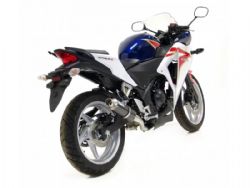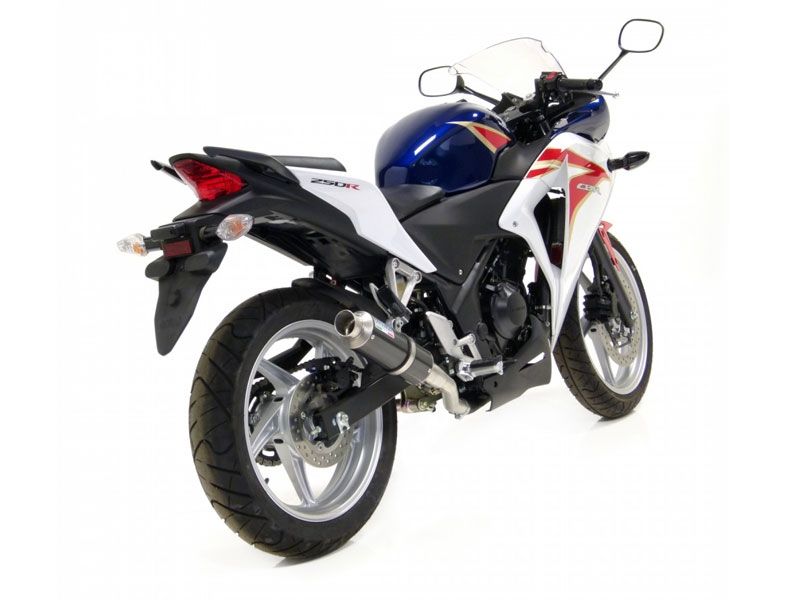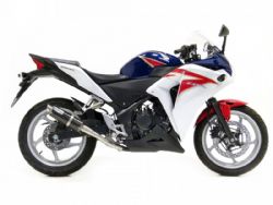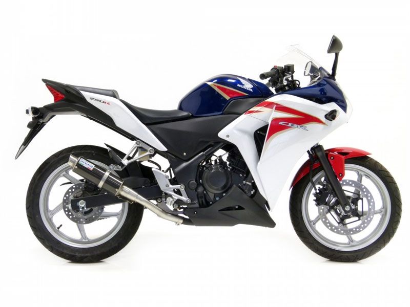 Escape completo Leovince 3472 Honda CBR 250 R 2011/2013 Gp Corsa Evo Carbono. Escape inspirado en Moto Gp y diseñado para motocicletas de 4 tiempos hasta 500cc de cilindrada. Silencioso fabricado en carbono brillante con salida cortada. Los colectores de gran diámetro garantizan un gran rendimiento. El escape se fija a la moto con una abrazadera en acero inox, con goma antivibraciones. El silencioso cuenta con una pegatina en aluminio con el logo de la marca para embellecer al silencioso.