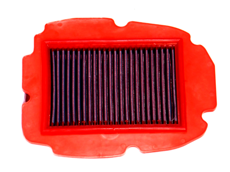 Filtro de potencia Bmc FM187/04 (Versión standard con menos entrada de aire). El filtro de aire Bmc Filter FM187/04 posee un diseño específico y está diseñado para colocar en sustitución al filtro de aire original. El filtro de potencia Bmc FM187/04 de alto rendimiento cuenta con la misma forma que el filtro standard, pero con una base de filtrado mayor. Este filtro reutilizable se caracteriza por su diseño que mejora notablemente la capacidad de aspiración de la toma de aire en comparación con los filtros tradicionales, mejorando también la calidad de la combustión. El filtro de potencia Bmc FM187/04 consta de una gasa de algodón de múltiples capas impregnada con aceite de baja viscosidad y recubierta con una malla de aluminio tratado con resina epoxy que garantiza la protección contra los humos del combustible y la oxidación debida a la humedad del aire. Las impurezas se filtran gracias al efecto pantalla y de retención, siendo capturadas por las fibras de algodón y retenidas por el aceite. Este proceso no obstruye la entrada de aire y garantiza el rendimiento constante del filtro de aire a largo plazo. El proceso de filtrado es continuo y los cuerpos extraños quedan depositados en el tejido sin bloquear el flujo de aire. El filtros Bmc está realizado mediante un sistema de “moldeado completo” que permite al característico filtro rojo ser de una sola pieza, sin juntas soldadas, lo cual evita la rotura. La goma que se utiliza en los sistemas de filtrado de aire Bmc es muy resistente y duradera, y posee unas características de adherencia óptimas para adaptarse a todas las formas de las cajas de aire.