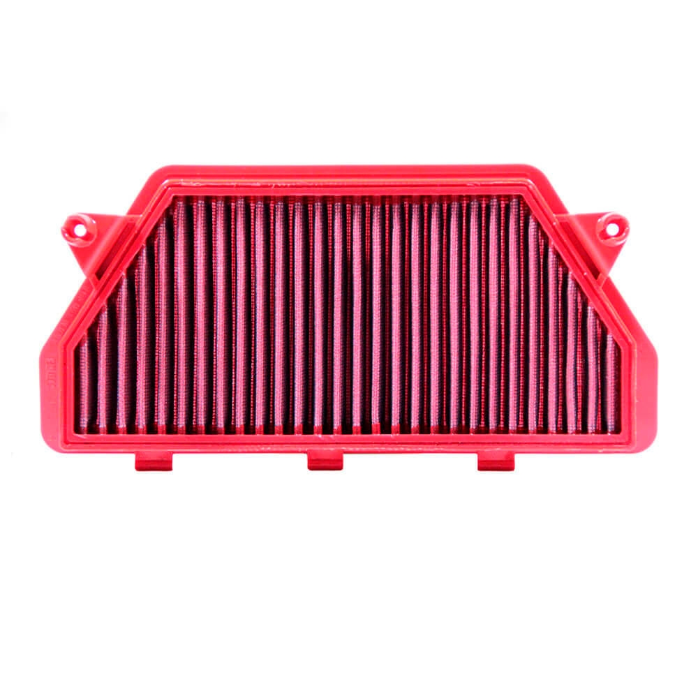 Filtro aire Bmc FM955/04RACE (Versión Race con más entrada de aire). El filtro de aire Bmc Filter FM955/04RACE posee un diseño específico y está diseñado para colocar en sustitución al filtro de aire original. El filtro de potencia Bmc FM955/04RACE de alto rendimiento cuenta con la misma forma que el filtro standard, pero con una base de filtrado mayor incluso que los filtros Bmc standard). Este filtro de carreras reutilizable se caracteriza por su diseño que mejora notablemente la capacidad de aspiración de la toma de aire en comparación con los filtros tradicionales, mejorando también la calidad de la combustión. El filtro de potencia Bmc FM955/04RACE consta de una gasa de algodón de múltiples capas impregnada con aceite de baja viscosidad y recubierta con una malla de aluminio tratado con resina epoxy que garantiza la protección contra los humos del combustible y la oxidación debida a la humedad del aire. Las impurezas se filtran gracias al efecto pantalla y de retención, siendo capturadas por las fibras de algodón y retenidas por el aceite. Este proceso no obstruye la entrada de aire y garantiza el rendimiento constante del filtro de aire a largo plazo. El proceso de filtrado es continuo y los cuerpos extraños quedan depositados en el tejido sin bloquear el flujo de aire. El filtros Bmc está realizado mediante un sistema de “moldeado completo” que permite al característico filtro rojo ser de una sola pieza, sin juntas soldadas, lo cual evita la rotura. La goma que se utiliza en los sistemas de filtrado de aire Bmc es muy resistente y duradera, y posee unas características de adherencia óptimas para adaptarse a todas las formas de las cajas de aire.