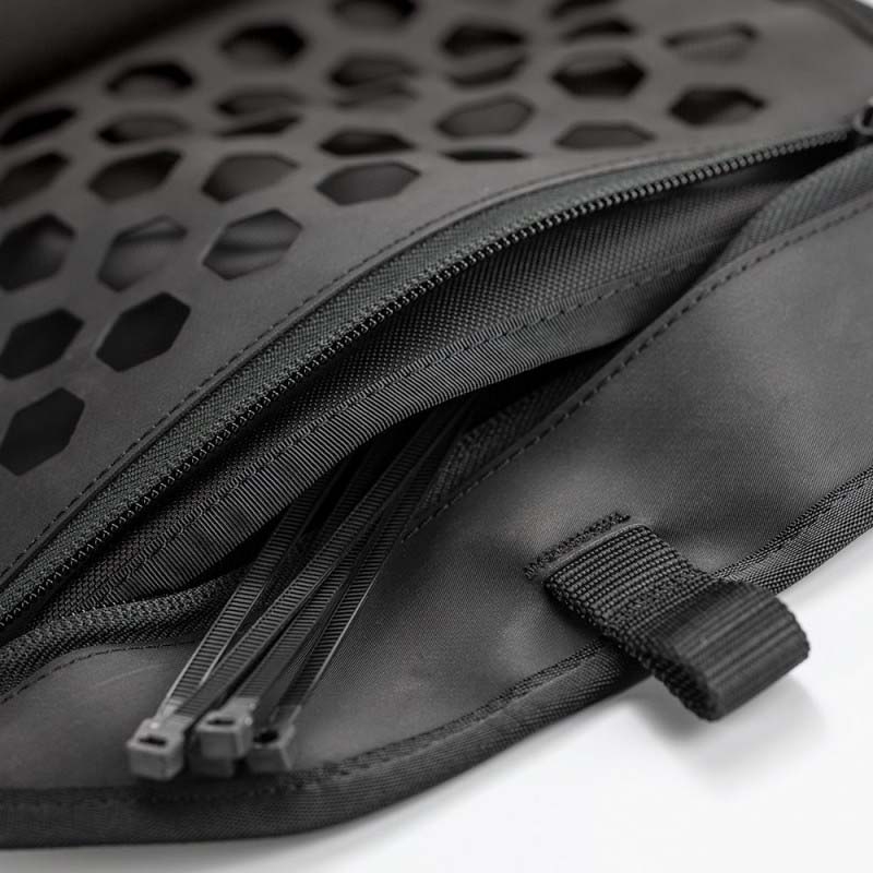 Su diseño ofrece espacio de sobra para herramientas esenciales como desmontadores, kit de reparación, llaves, multiherramientas y recambios. Incorpora bolsillos con cremallera YKK para mantener cada cosa en su sitio y evitar que se mezclen o se pierdan piezas por el camino.