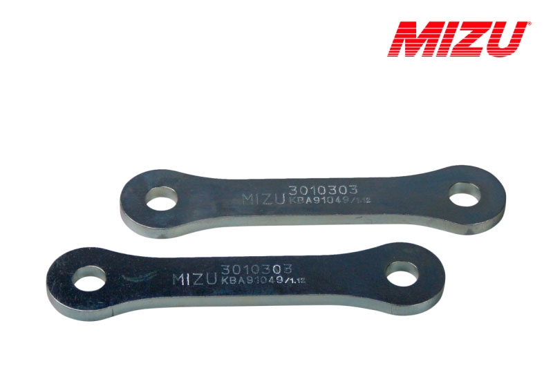 Kit aumento de altura Mizu 3010303. Kit de suspensión Mizu 3010303 que permite subir la suspensión. Realizado con materiales de alta calidad, el kit Mizu cuenta con garantía de 3 años. Con los kits de suspensión para moto Mizu podrás bajar o subir la altura de tu moto sin que por ello tengas que modificar la geometría. Diseñados y fabricados en Alemania bajo las directrices de la ISO 9001 y con certificado de homologación europea TÜV. Para garantizar la compatibilidad del kit Mizu es necesario comprobar el Tipo especificado en la ficha técnica.