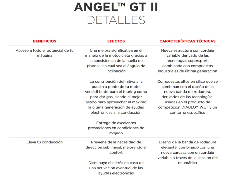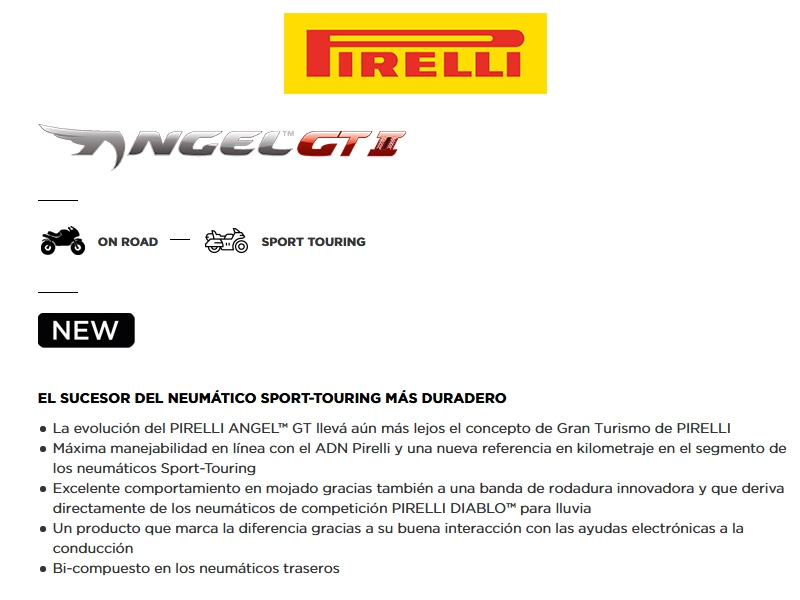 Neumático Pirelli Angel GT 2 150/70/17 W69 R 3111600. El nuevo Pirelli Angel GT 2 es la nueva referencia en kilometraje dentro del segmento de neumáticos Sport-Touring. Pirelli no ha sólo ha aumentado la durabilidad respecto al neumático Angel GT, también la manejabilidad ha sido mejorada así como el agarre sobre carreteras mojadas. Esto se debe en gran parte a la nueva e innovadora banda de rodadura derivada de los neumáticos de competición Pirelli Diablo Slick Rain. Precio por neumático.