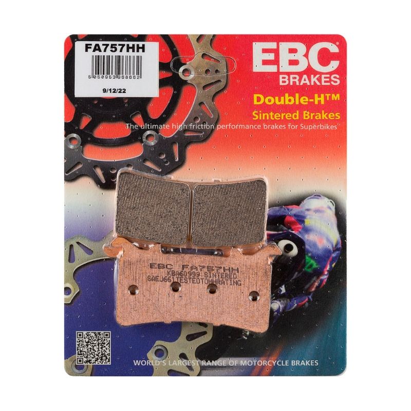 Pastillas de freno Ebc FA757HH. Las pastillas de freno Ebc FA757HH (Doble-H) de Ebc se caracterizan por su excelente potencia de frenado en todas las condiciones climáticas. Estas pastillas se benefician del índice HH de alta fricción para obtener la máxima intensidad en la frenada. Fabricadas a base de una aleación de cobre como las pastillas originales, se obtiene una mayor durabilidad y un proceso de frenado perfecto bajo todo tipo de condiciones: suelo mojado o seco, calor o frío. Cuando es necesario, se incorporan placas de acero inoxidable para reducir la transferencia de calor hacia el sistema hidráulico de la motocicleta. El exclusivo diseño de doble segmento con ventilación mantiene las pastillas Ebc FA757HH a baja temperatura y previene el riesgo de debilitación del freno, de sobrecalentamiento o la pérdida de eficacia de la frenada. Precio por juego.