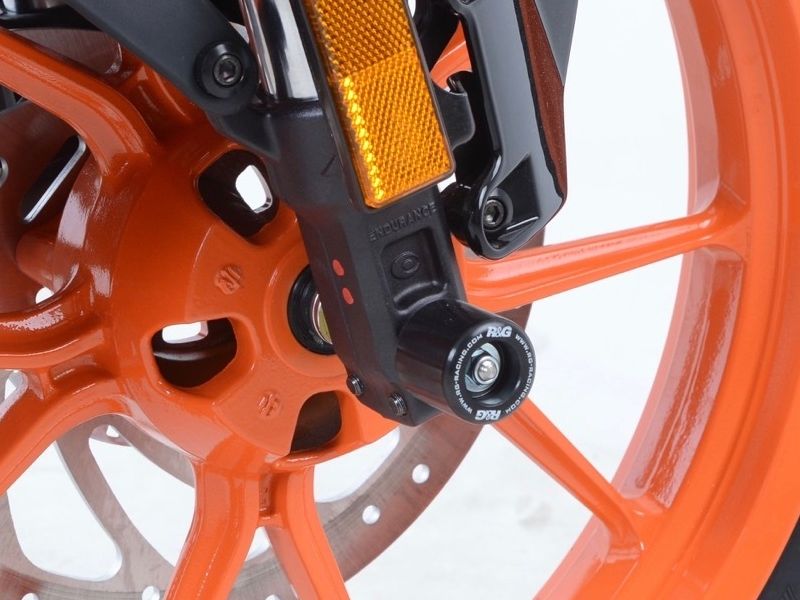 Protector horquilla Rg-racing FP0106BK. El protector de horquilla Rg-racing FP0106BK está diseñado para minimizar los daños de la horquilla, pinzas de freno y tuercas del eje en caso de una caída leve. Fabricados con material altamente resistente a la abrasión. Precio del juego de protectores. Imagen genérica.