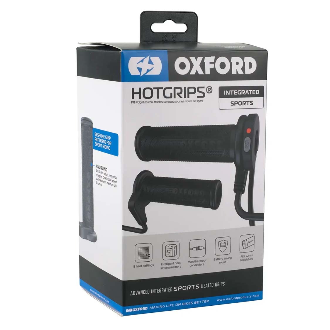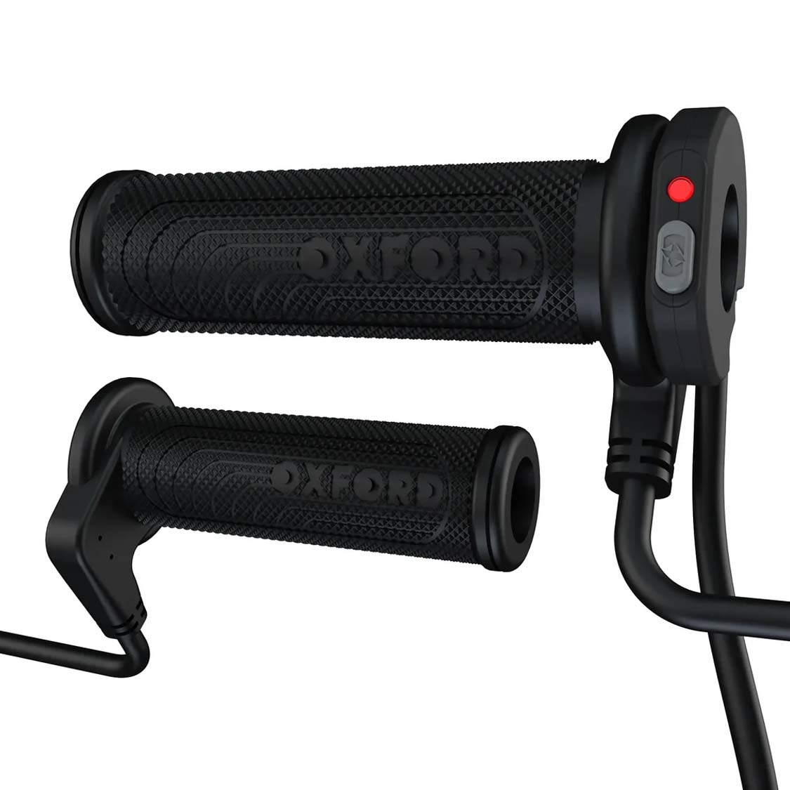 Puños calefactables Oxford EL399 HotGrips Advanced Integrated Sport con mando integrado slimline, 5 niveles de calor, memoria inteligente, LED regulable, conectores IP67 y modo ahorro de batería (incluye modo para baterías de litio). Para manillares de 22 mm y longitud ajustable 114-123 mm. Tacto sport y confort en invierno en Ramírez Moto.