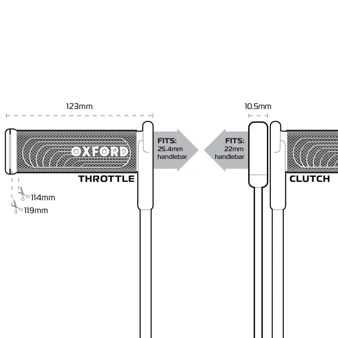 Los puños Oxford EL399 son recortables y de extremo abierto, para poder montar distintos contrapesos y accesorios de punta de manillar según tu configuración.