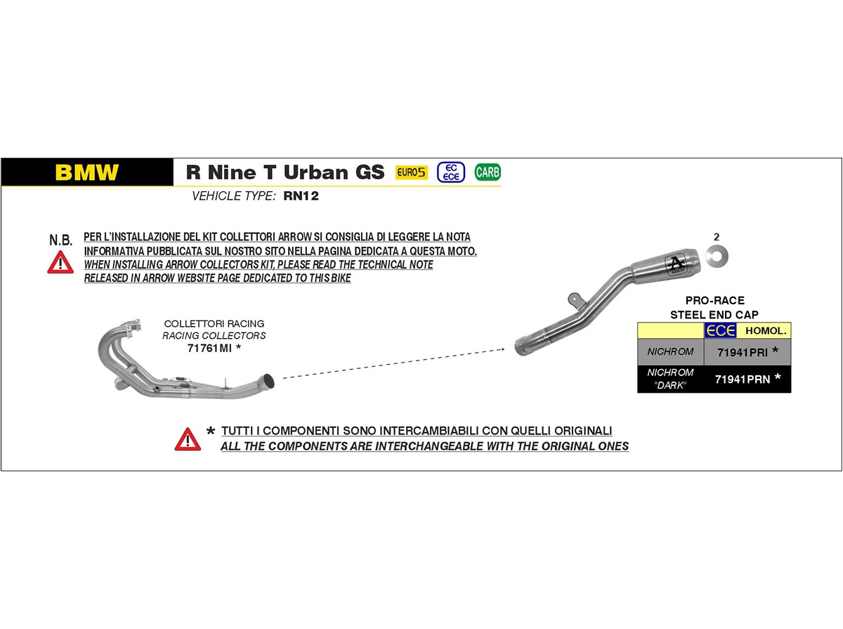 Silencioso escape Arrow 71941PRN Pro-Race BMW R Nine T Urban GS 2021-2022. El escape slip-on Arrow Pro-Race deriva directamente de los escapes de Moto Gp con forma de trompeta. Para compensar la reducción del volumen, Arrow ha trabajado arduamente en la investigación de los mejores materiales fonoabsorbentes y termo aislantes. Se han realizado innumerables pruebas en pista y en el Departamento de Investigación y Desarrollo que le han permitido a Arrow introducir materiales y tecnologías nuevas más eficaces en el proceso de producción. (La información que facilita Ramirez Motoracing es orientativa y sujeta a la verificación en la web del fabricante).
