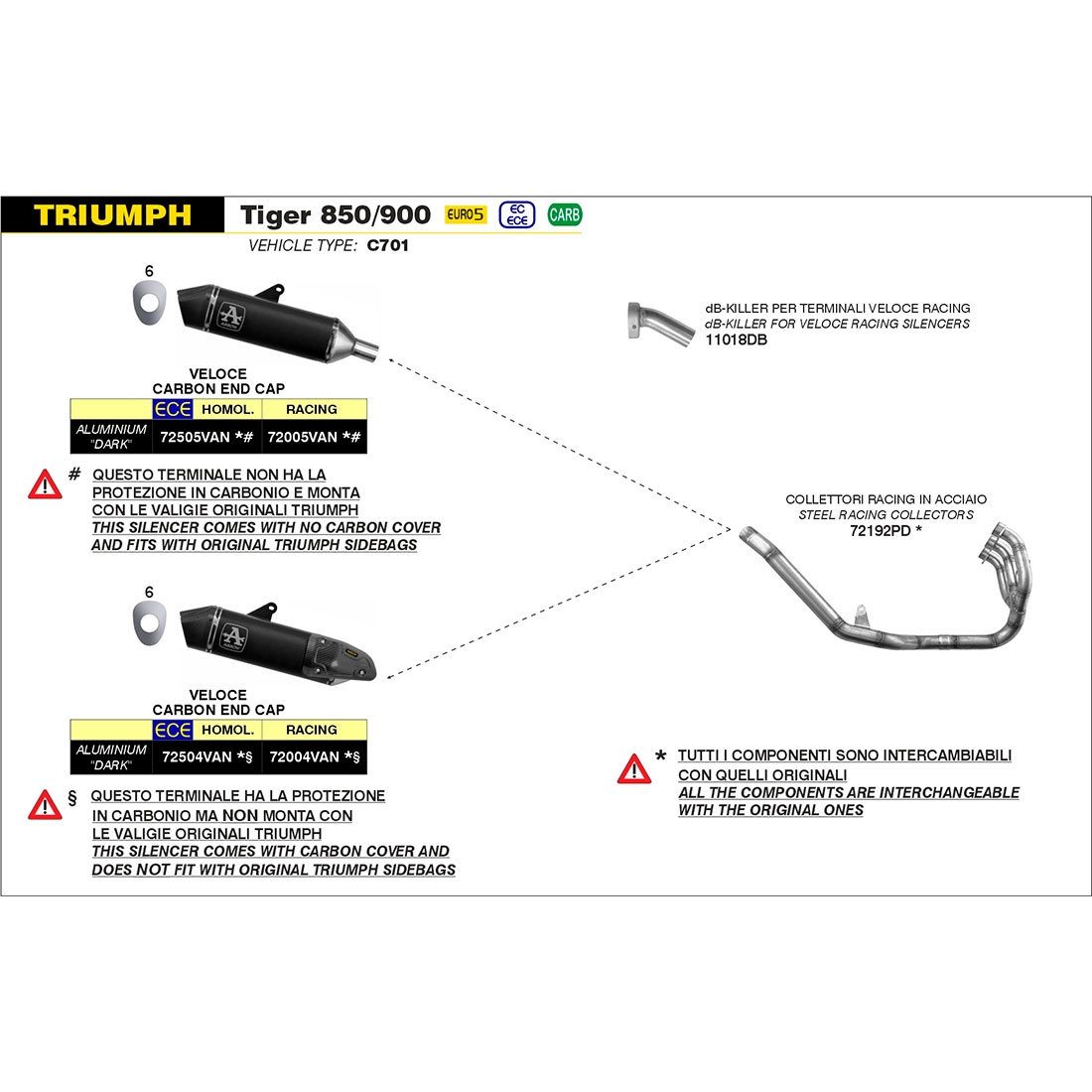 Caracaterísticas técnicas del escape silencioso Arrow Veloce racing Triumph Tiger 900 2020-2023: