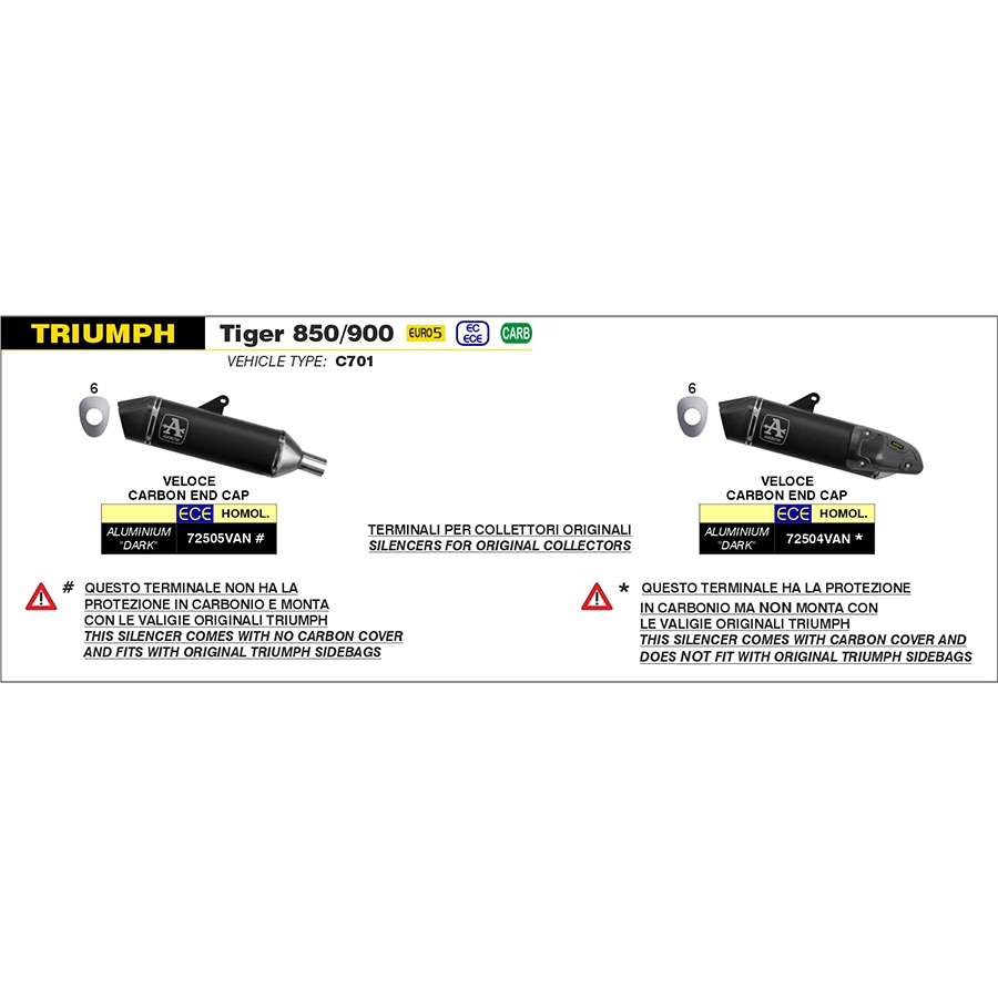 Silencioso escape Arrow 72504VAN Veloce Triumph Tiger 900 2020-2023. El nuevo estándar para crear silenciadores de escape para moto pequeños y funcionales es Arrow Veloce. Capaz de liberar la mayor cantidad de energía posible sin sacrificar pesos o volúmenes. El escape de moto Arrow 72504VAN Veloce Triumph Tiger 900 2020-2023 con su forma de pequeña "lágrima" es ideal para combinar con las demandas estilísticas más nuevas, y su terminal romboidal caracteriza un sonido distintivo y profundo en toda la gama.